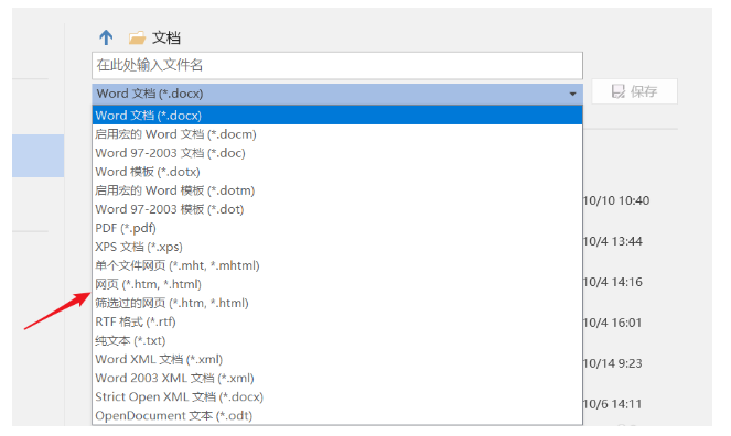 打开 Word 文档,点击菜单栏的文件——另存为选项,选择保存为网页格式,如图,