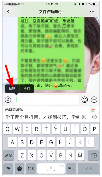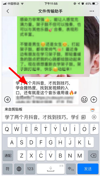 3. 然后打开手机中的微信、QQ、备忘录,将复制的链接进行粘贴,删除链接,只留下文字,