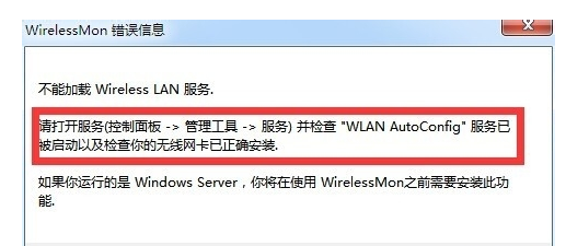 运行 wirelessmon 程序,当弹出如图所示的错误窗口时,我们可以通过以下方法来解决:安装无线网卡,并确保无线网卡驱动正常;进入"计算机管理"——"服务和应用程序"——"服务"选项卡,确保成功开启"Wired AutoCofig"和"WLAN AutoConfig"服务。