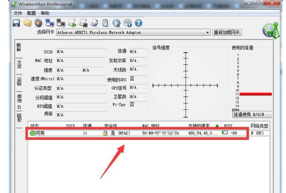 2. 从 wirelessmon 程序主界面,就可以查看到当前周围所有的 WiFi 信号,其中也包括隐藏的 Wifi 信号,如图所示。由此可以和到隐藏 WiFi 信号的"信道". "安全类型"以及"MAC 地址"信息。