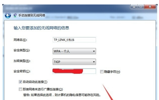 6. 根据之前所截获的隐藏 WiFi 信号信息,在"手动连接到无线网络"界面中,输入相关信息即可连接到指定隐藏无线 WiFi 网络。