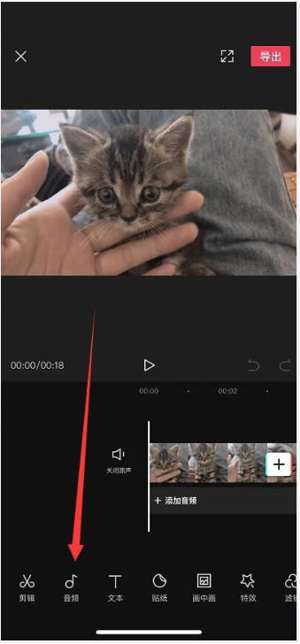 视频导入成功,进入剪辑窗口,在下方菜单栏中点击"音频",如图,