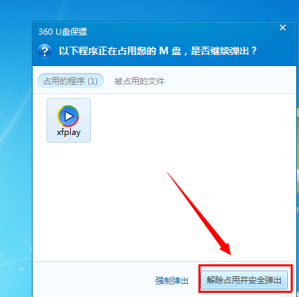 4. 从弹出的" 360 U 盘保镖"界面中,就可以查看到"占用的程序"和"被占用的文件",我们可以直接点击"解除占用并安全弹出"按钮,以安全弹出 U 盘。