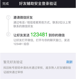 通知微信朋友向你的微信帐号发送指定内容,从而实现辅助验证,审核速度由辅助验证的好友数量决定。审核通过后,才能成功登录你的微信帐号。