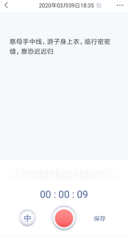2. 点击"录音",在弹出界面点击红色按钮即可录音,录音结束点击"保存",在弹出界面点击"转文字"就可以将语音转换成文字,如下图: