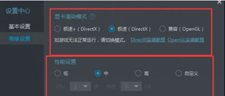4. 之后在"设置中心"的"高级设置"中就可以看到"显卡渲染模式"了,我们只需根据自己电脑的情况来选择渲染模式即可。