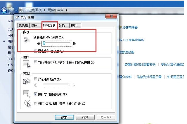 在鼠标属性的指针选项下就可以调节鼠标指针移动速度,