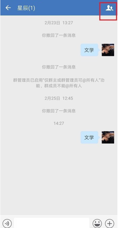 在手机中打开企业微信,进入界面,点击一个群聊,进入聊天窗口,点击右上角的图标,