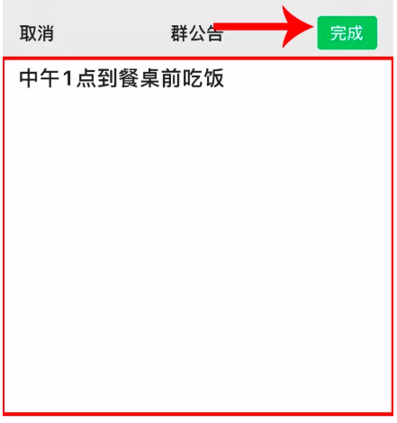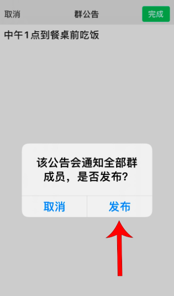 打开群公告功能,在空白位置输入文字内容,点击“完成“,出现提示,该公告会通知全部群成员,点击“发布“,