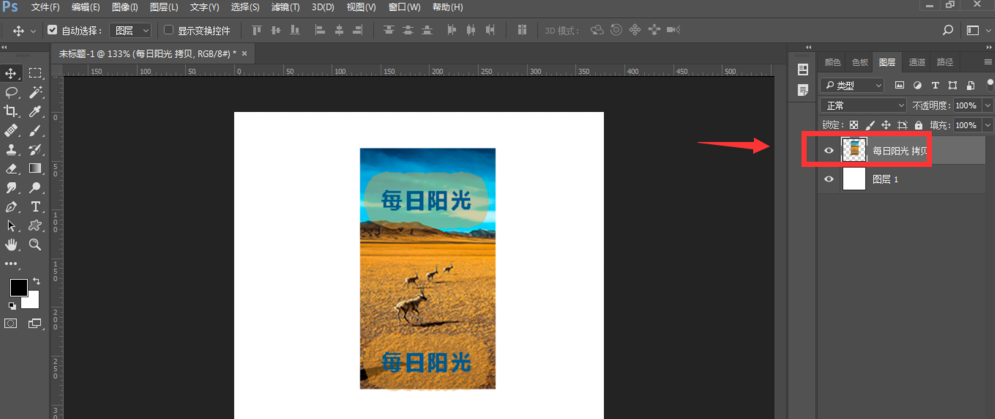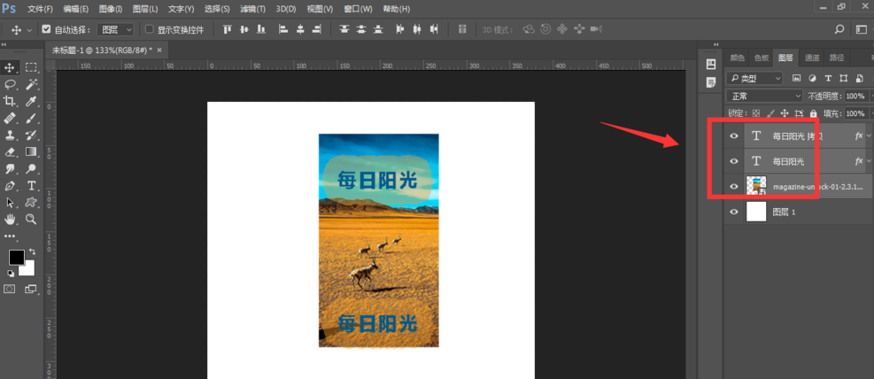 然后在文档中输入文字,现在已经有了两个图层,文字图层和图片图层,还可以再设置几个图层,