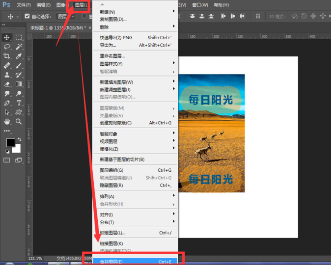 然后选择打开图层菜单栏,找到里面的合并图层“快捷键ctrl+e“,