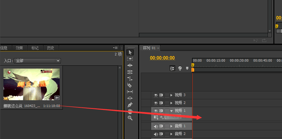2. 用鼠标直接把视频素材拖到序列面板的视频轨道;