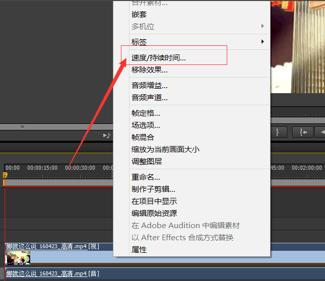3. 鼠标右键点击视频素材,选择“速度/持续时间...”;不同版本可能不同;