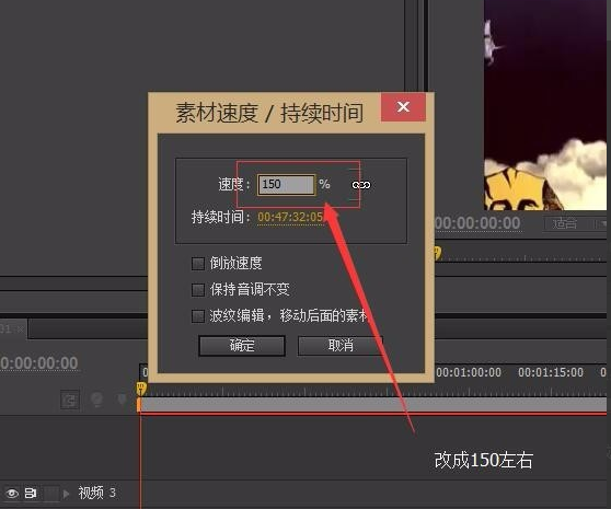 4. 弹出来的“素材速度/持续时间”面板将速度改到 150 左右,具体多少可以自己尝试,小编试过调到 200,那时候声音就听不太懂了;