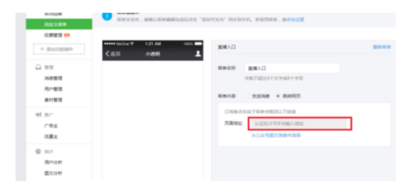 5. 把直播间链接设置在微信公众号菜单栏,微信公众号左边【自定义菜单】-【菜单名称】-【跳转网页】,把复制好的直播间入口链接复制进去即可。