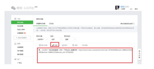 6. 广而告之(群发消息),现在群发消息告诉粉丝们你的直播开始啦!要是你的公众号跟小编一样未认证,不能进行上一步,那么可以直接跳到这步,把上面直播间的入口链接群发给粉丝,也是一样的!