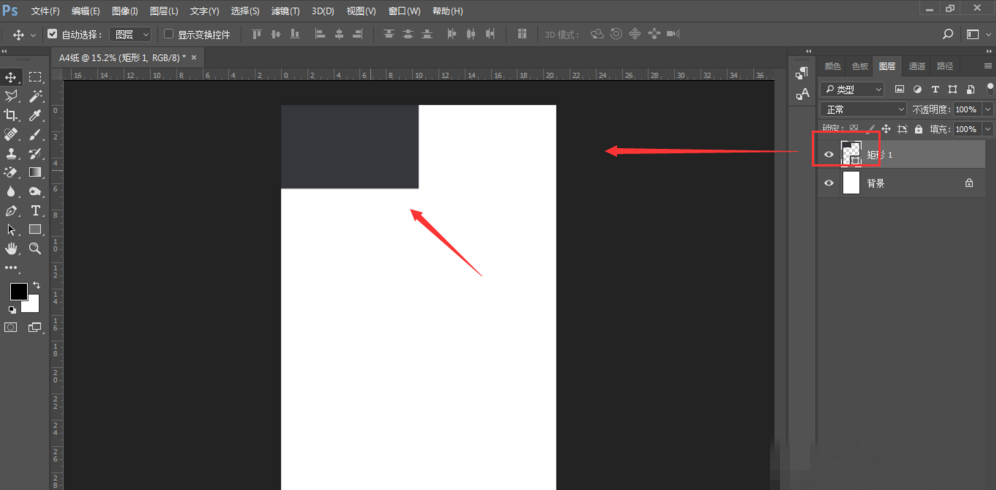 打开 PhotoShop 软件,在画布中绘制一个矩形(或其他图形均可)。
