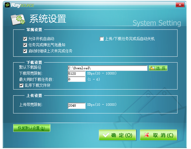 进入系统设置面板,你可以进行”常规设置”、”下载设置”、”上传设置”,自行勾选相关选项,然后点击确定,