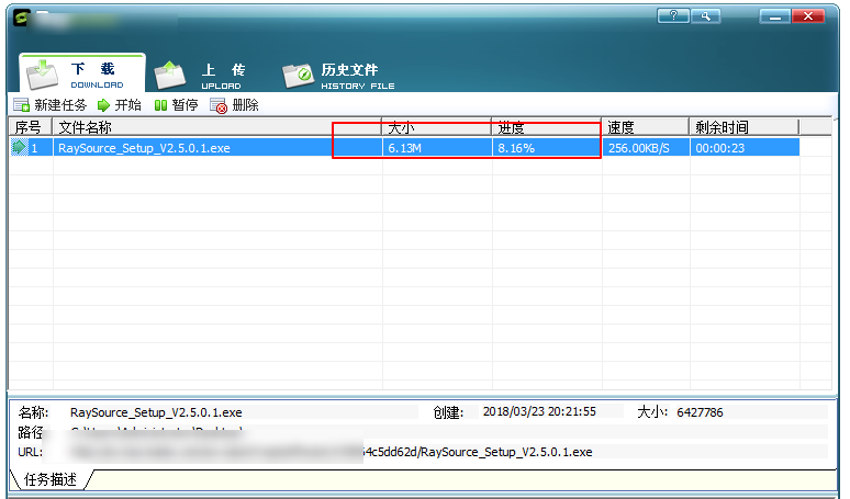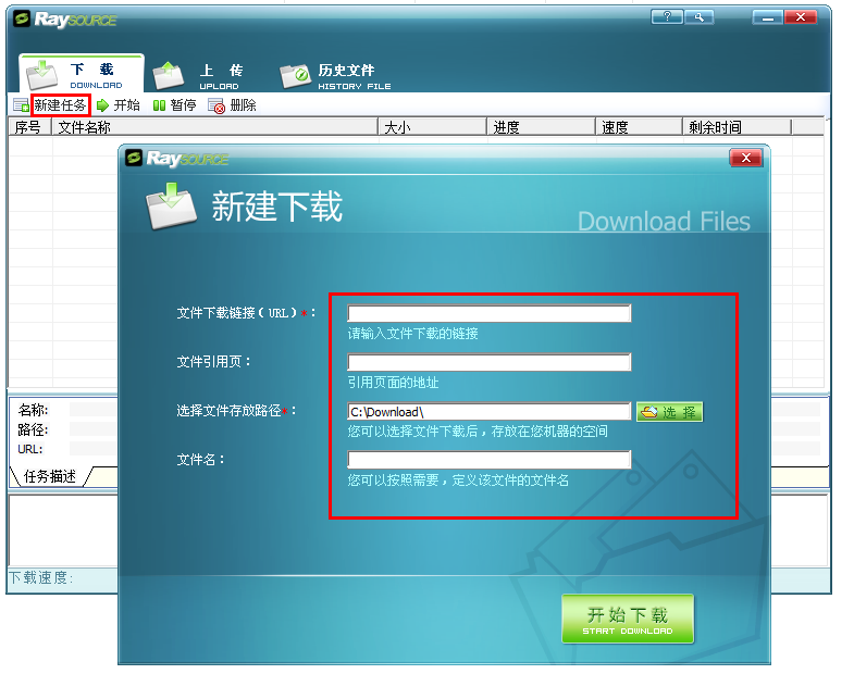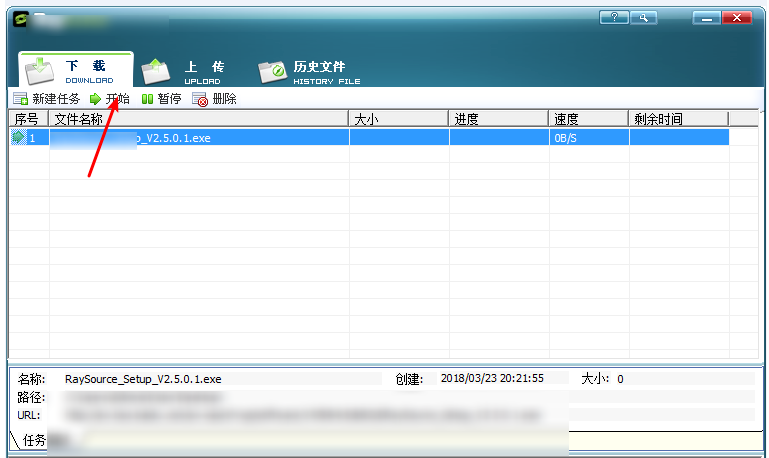 重新运行 RaySource ,如图,点击”新建任务”选项,弹出窗口,输入文件下载链接,选择文件存放路径,还可以设置文件名,然后点击”开始下载”,