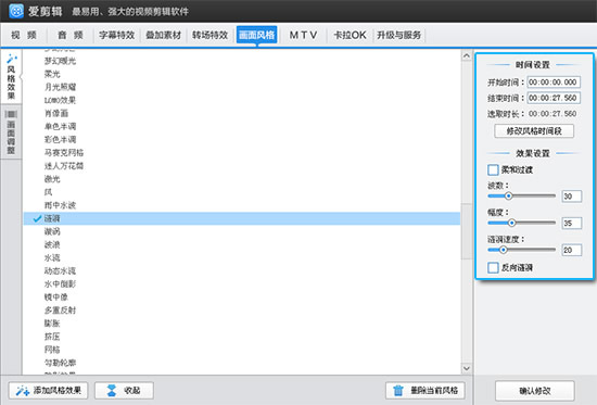 按照步骤一或步骤二添加画面风格后,在画面风格列表右侧,我们会看到画面风格“时间设置”. “效果设置”等的具体参数,我们可以在这里进行设置,并点击底部的“确认修改”按钮即可。