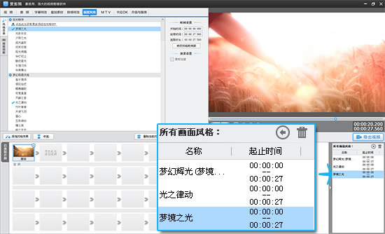 在“画面风格”面板右下角“所有画面风格”栏目中,即可看到我们为整个影片所添加的所有画面风格。在该列表鼠标左键选中某一画面风格后,画面风格列表右侧会切换到选中的画面风格的“时间设置”和“效果设置”,“已添加片段”列表中,应用该画面风格的第一个视频片段会高亮,以便我们了解该画面风格的详细信息并对其进行修改。