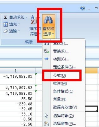 2. 比较关键的一步,点击”查找和选择“--”公式“。大家可以看到,带有公式的单元格都已经被选中。
