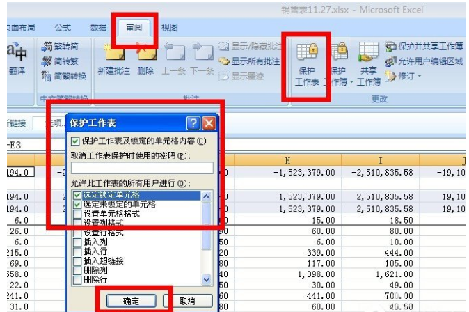 5. 点击审阅--”保护工作表“--”确定“,此时跳出保护工作表的对话框,可以在密码中输入密码或根据自己的需要在相对的选项目前打勾。此时,效果已经出来了,带公式的单元格已经被锁定,而其他单元格可以编辑。