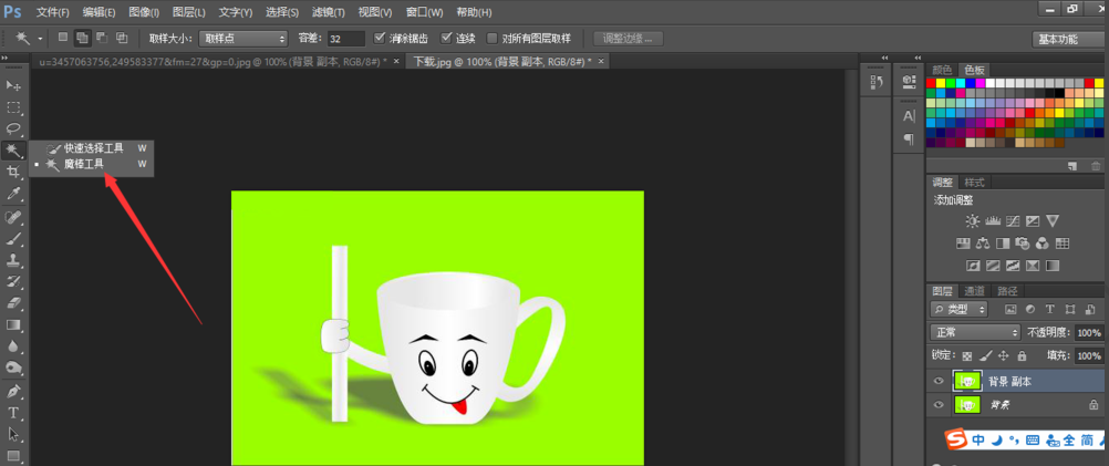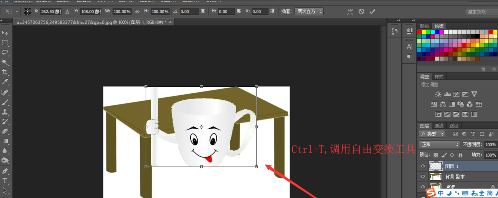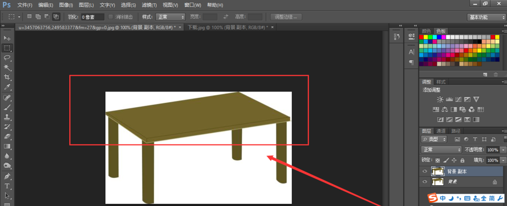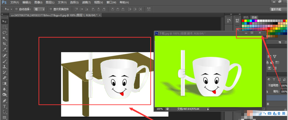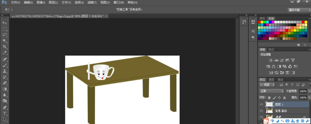 打开 PhotoShop ,把两张素材照放到 PS 软件里,我们为两个图片都复制一个背景层,然后在背景图层上准备把这个卡通杯子移动到这个卡通桌子上。这个操作完成后,我们即可明白在 PS 中应该怎么移动选好的区域。