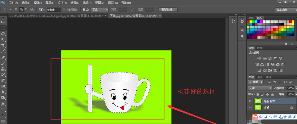 下图为使用魔棒工具构建好的选区,读者在杯子身体部位任意鼠标左键点击一下即可,然后就会获得下图相应的选区,如图所示。
