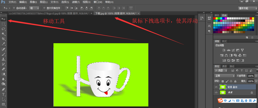 我们构建完选区后,点击工具栏上面的第一个工具 ,就是移动工具,点击完后,我们鼠标拖动杯子图层的选项卡,使得这个选项卡变成浮动效果,如图所示。