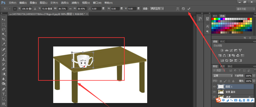 我们在这个自由选择框里面按住Shift键,对其进行等比例缩放,变成一个适合的比例后放到桌子上,确认完毕后,点击对勾符号即可显示我们最终的效果图,如图所示~