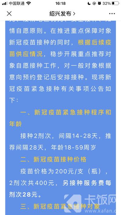 疫苗价格为 200 元 / 支(瓶),2 剂次共 400 元,另接种服务费每剂次 28 元。