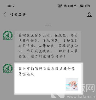 4. 随后点击聊天中的【绍兴市新冠肺炎病毒疫苗接种意愿登记表】进入预约页面;