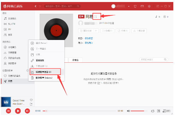 2. 创建完歌单后,接下来我们用鼠标右键点击该歌单,然后打开“编辑歌单信息”。或者打开该歌单点击歌单名字旁边的“编辑”按钮,如下图: