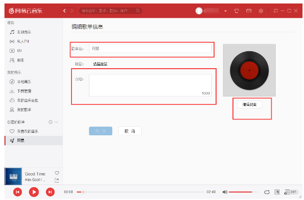 3. 来到编辑页面后我们就可以更改歌单名字了,还有它的介绍、歌单封面等。