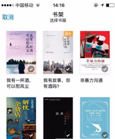 4. “编辑”跳转为“取消”,此时我们可以选择要设为私密阅读的书籍,将该书籍右下角的对勾选中,对勾由灰色显示为蓝色即为选中;