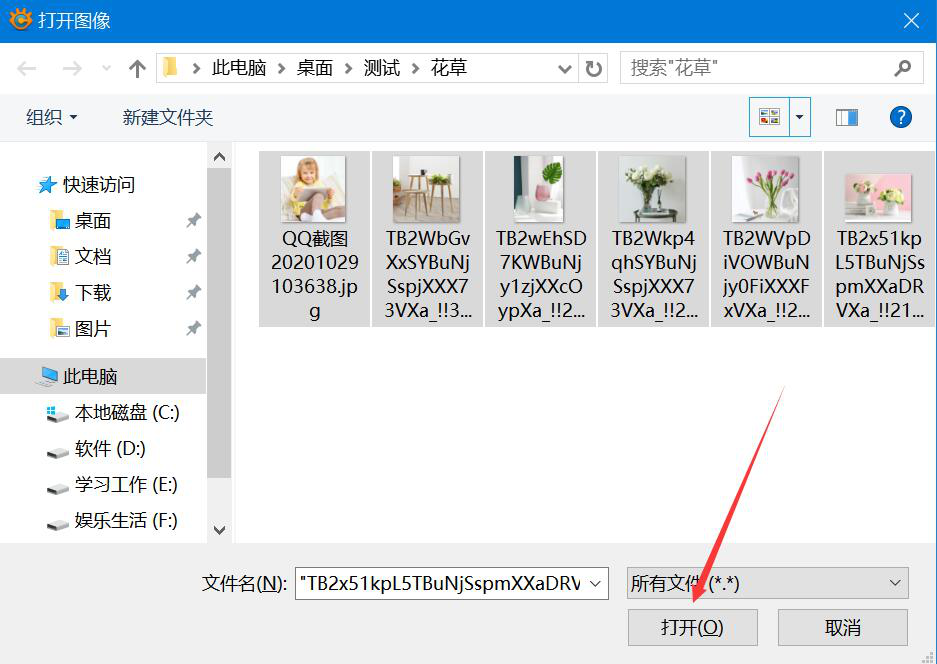 2. 在弹出的窗口中,将需要 XnConvert 批量裁剪的图片一并选中,再点击“打开”按钮。
