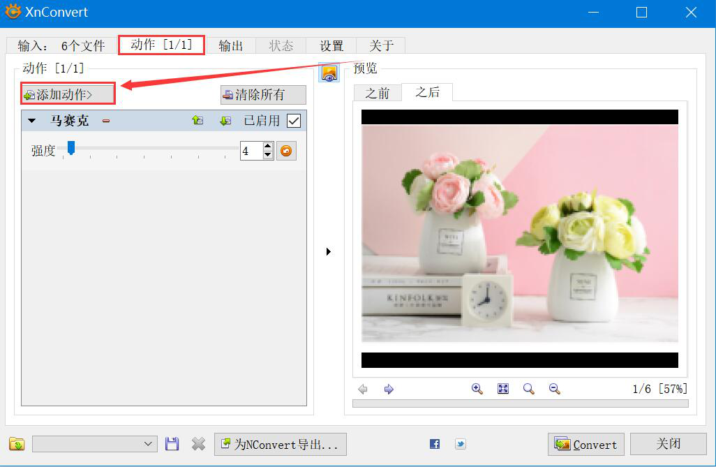3. 然后,切换至 XnConvert 的“动作”选项卡界面,点击“添加动作”按钮。
