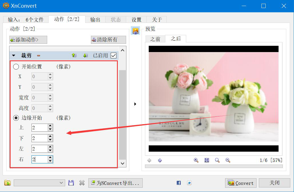 5. 接下来,根据自己的实际需要选择 XnConvert 批量裁剪图片的方式,这里选择的是从边缘开始裁剪,将上、下、左、右几个方面都设置为2。同时,可以在预览窗口中预览到裁剪后的图片效果。