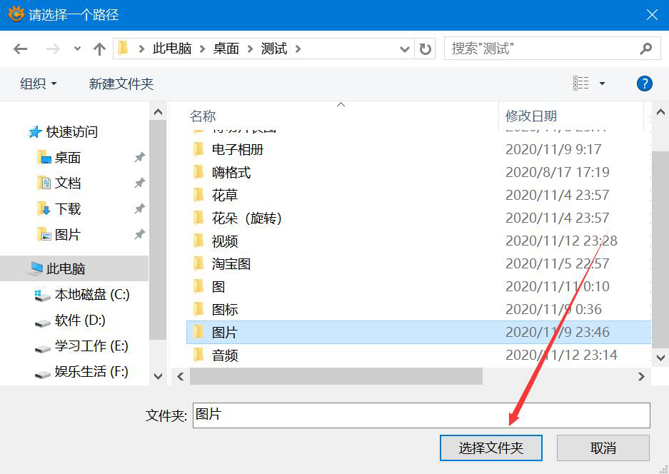 7. 在弹出的窗口中,选择图片批量裁剪后的保存路径,再点击“选择文件夹”按钮。
