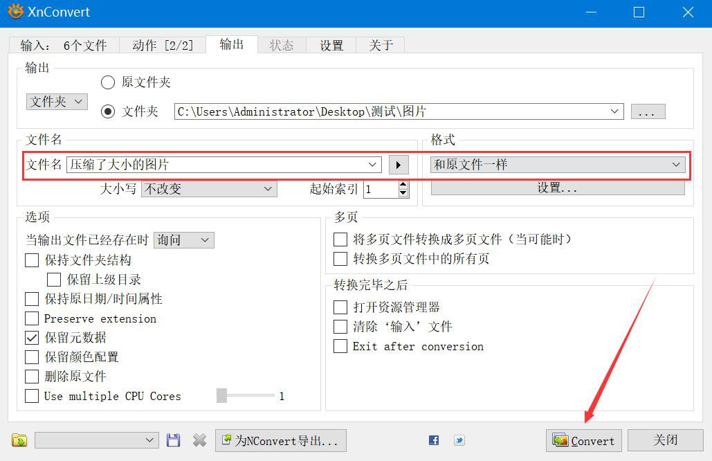 8. 除了可以更改路径,还可以设置文件名、图片输出的格式,设置好了,点击界面右下方的“Convert”按钮, XnConvert 便开始批量裁剪图片。