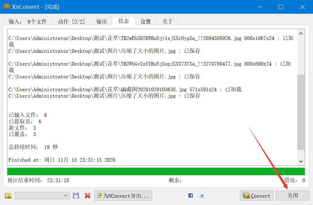 9. 最后,当“状态”选项卡界面中显示图片已保存,说明 XnConvert 完成了图片的批量裁剪,我们直接点击“关闭”按钮即可。