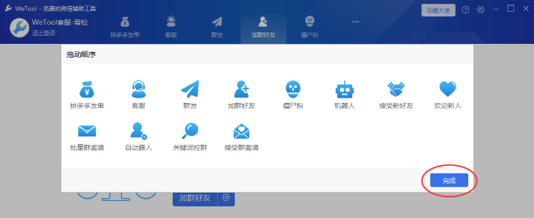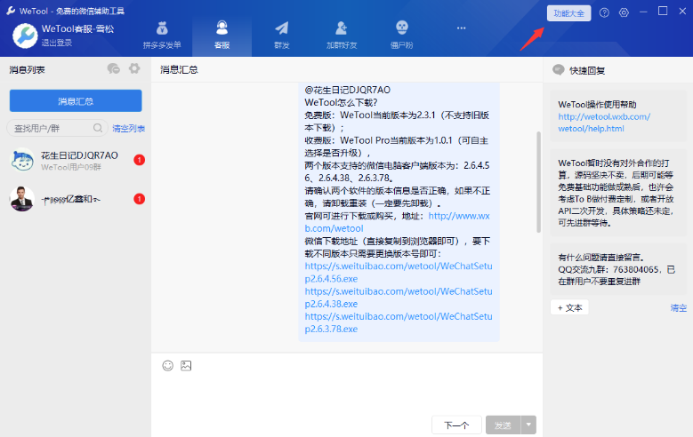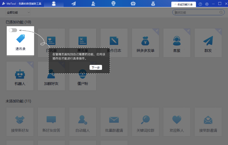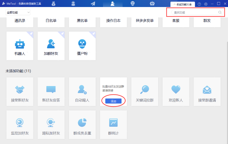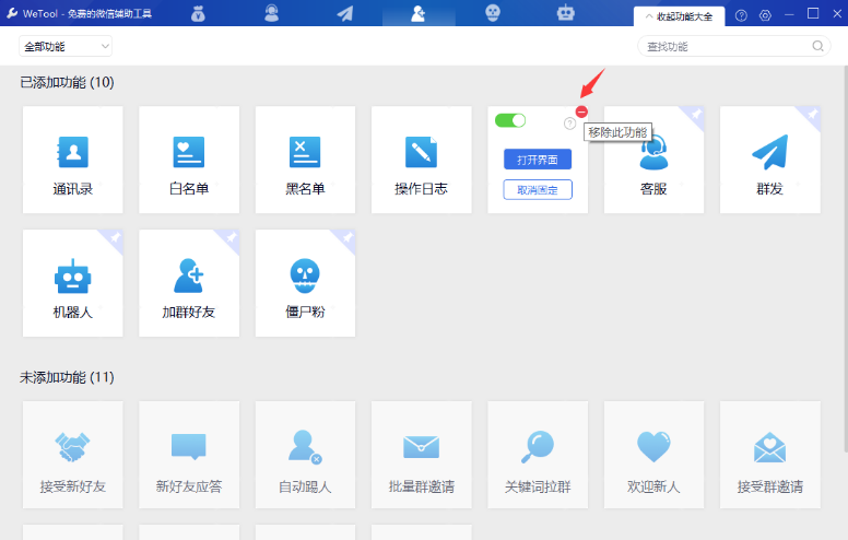 2. 登录后会看到软件界面右上角有“功能大全”,点击它可以添加需要的功能,也可以移除不需要的功能,如下图: