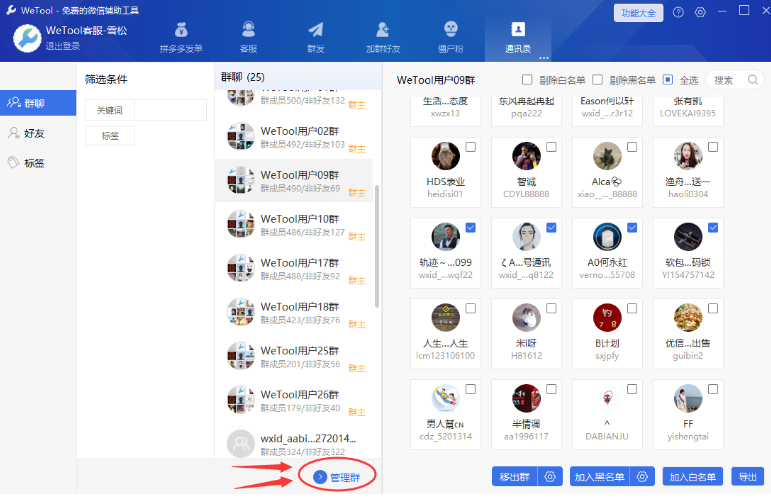 5. 点击“通讯录”——“群聊”,选择一个群可以看到群的成员,选中一个成员可以对其进行“移出群”、“加入黑名单”、“加入白名单”等操作,点击“管理群”可以对群进行相关操作,如下图: