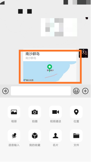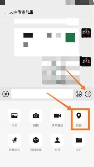 1. 打开微信,在任意好友或群窗口中找到“定位”功能键。具体步骤如图,点击最下方输入栏右侧“+”,在其弹窗菜单中点击“定位”。