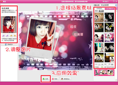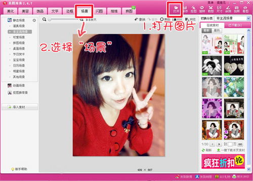 为了摆脱大头照千篇一律的模式,我们可以给单调的图片加个漂亮的场景,先进入“场景”菜单下。