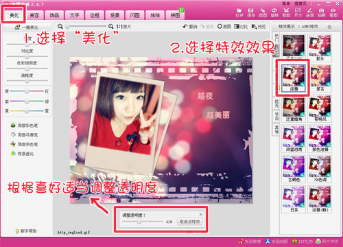 3. 场景添加好后,图片艺术效果已经初步形成。为了使照片跟选择的场景素材更加融合,同时使照片更有艺术感,给照片添加一些特效。进入“美化”菜单下,根据喜好选择特效。当然,除了添加图片特效外还可以增加文字、饰品等,发挥自己的创意来装饰照片。