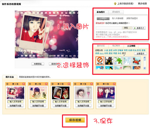 先导入我们处理好的图片,然后选择装饰的边框、漂浮、挂饰等,预览效果,满意后保存,动感影集就完成啦!