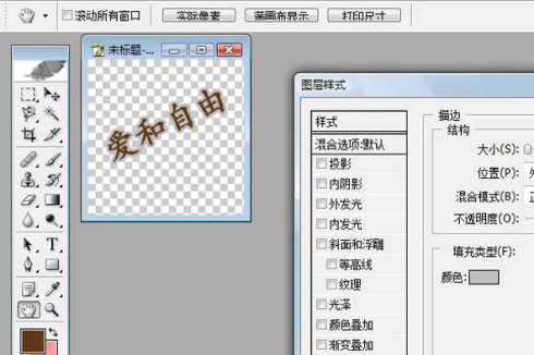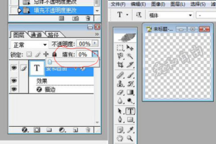6. 字写好了,我们来把它变成空心的。在右下方的工具栏中找到“填充”,将默认的 100 %改成 0,字就是空心的了。字已经做成空心的了,是不是就可以结束了呢,还不行,因为如果这样直接填充在图片上的话,水印太显眼了,有喧宾夺主的感觉,还要把它再做得淡一些