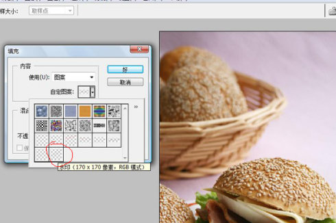 10. 找出你要加水印的图片,点“编辑 -> 填充”,在弹出的框中选择刚才做的水印,点“好”确认,然后点“文件 -> 存储”,水印就加好了